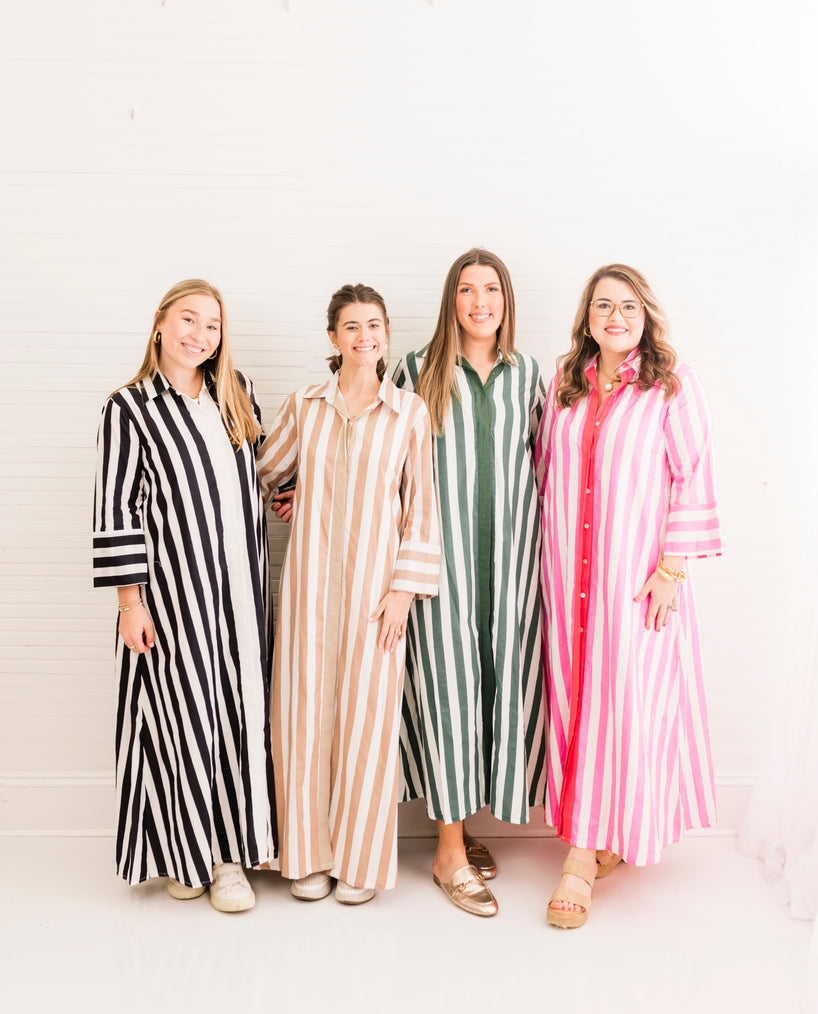 This finely tailored Beach Stripe Cabana Caftan Dress serves as both a sophisticated outfit and a chic swim cover-up. Featuring a distinguished collar with fabric-covered buttons, it presents a polished look. Made from 100% cotton and fully lined, each piece showcases unique artisanal details. Its flattering cut adapts smoothly across seasons, making it a smart addition to your wardrobe. For care, machine wash cold and air dry to preserve the artisanal print. Lightweight and breathable, this dress with classic cabana stripes ensures comfort and style from beach relaxation to casual dining.