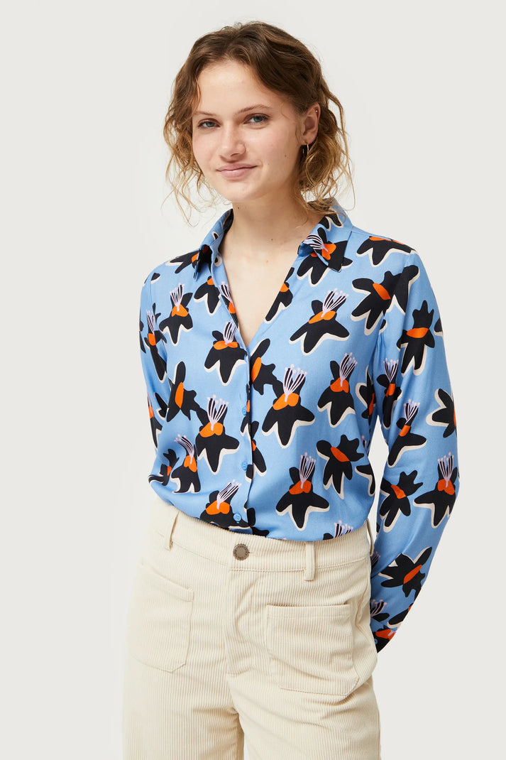 Blue viscose twill shirt with black and yellow flower print. With lapel collar and long sleeves ending in cuffs. Front button closure