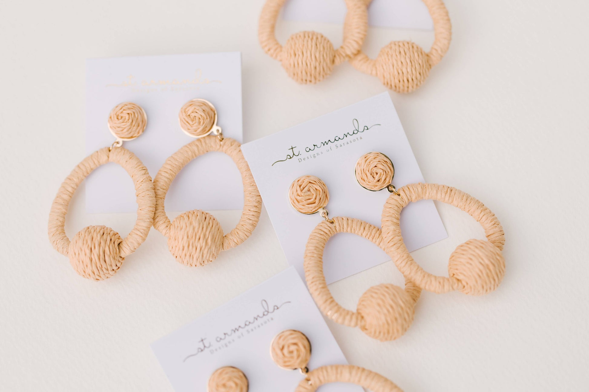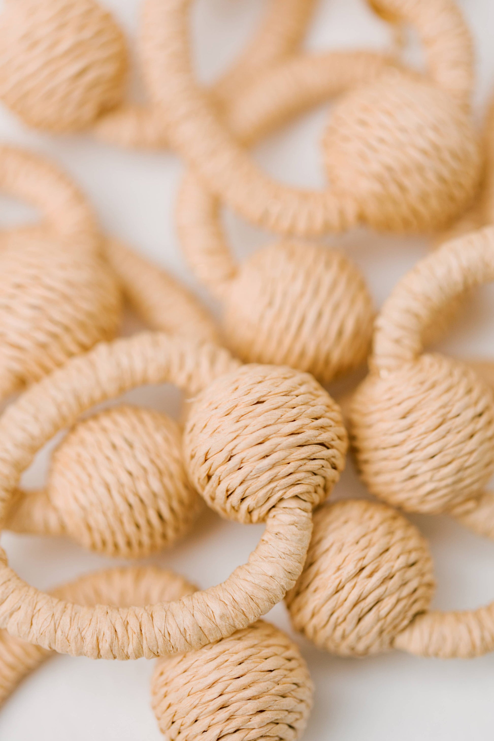 Our brown raffia pom pom hoops are a top seller and ready for resort season! This swinging style is sized perfectly and weightless. It matches everything from brightly colored resort wear to fun, everyday dresses!