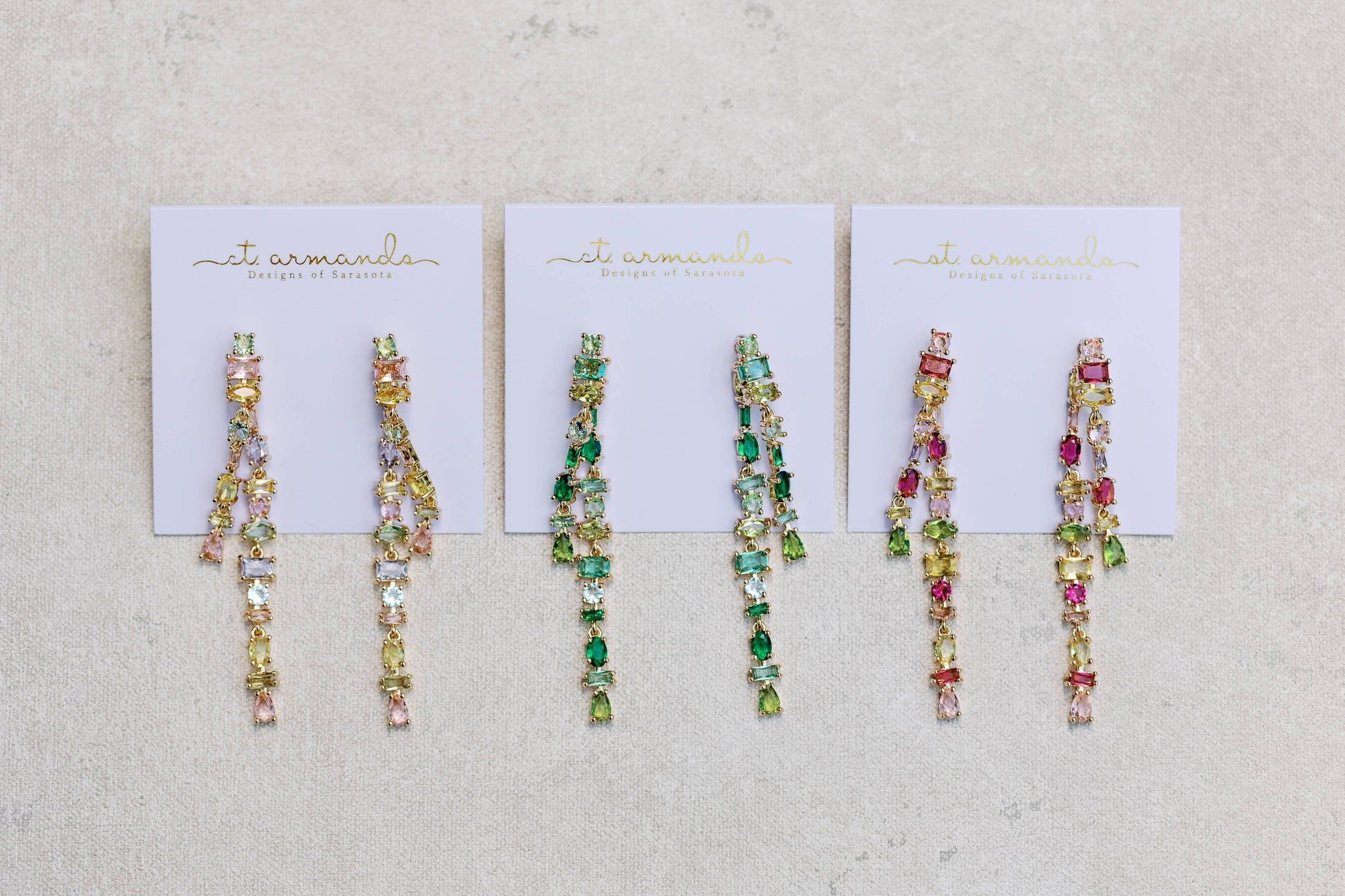 Our Layered Duster Earrings are adorned with jewel-toned rhinestones in an array of shapes and colors. These earrings showcase a blend of emerald, olive green, turquoise, and citrine stones, creating a vibrant and sophisticated look that is perfect for all year. This lightweight style is 3” in length.