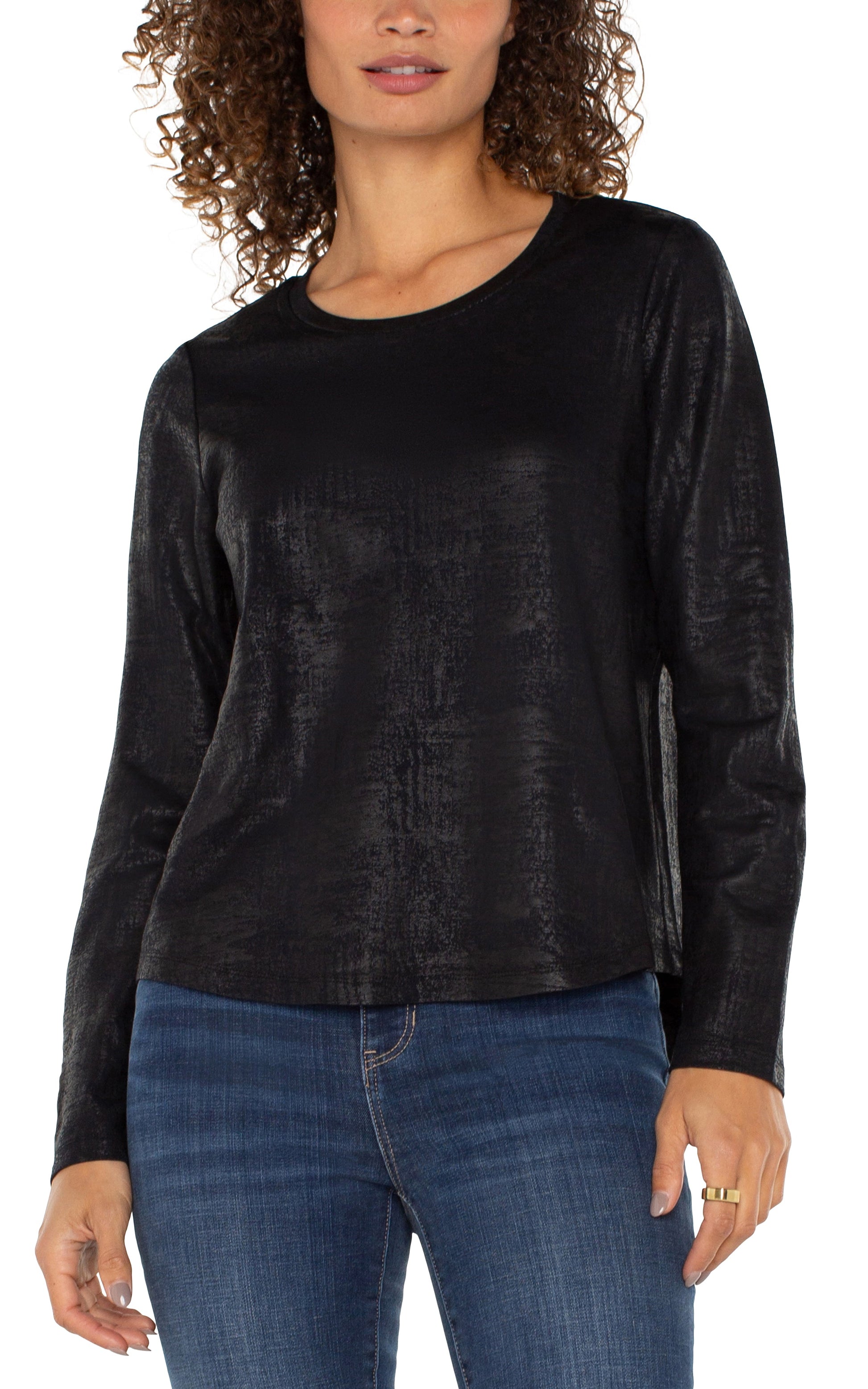 Versatile and timeless, our scoop neck knit top in black distressed fabric is the perfect blend of comfort and contemporary fashion. Combine effortlessly with your go-to denim and boots, or switch to trousers for a refined style.
