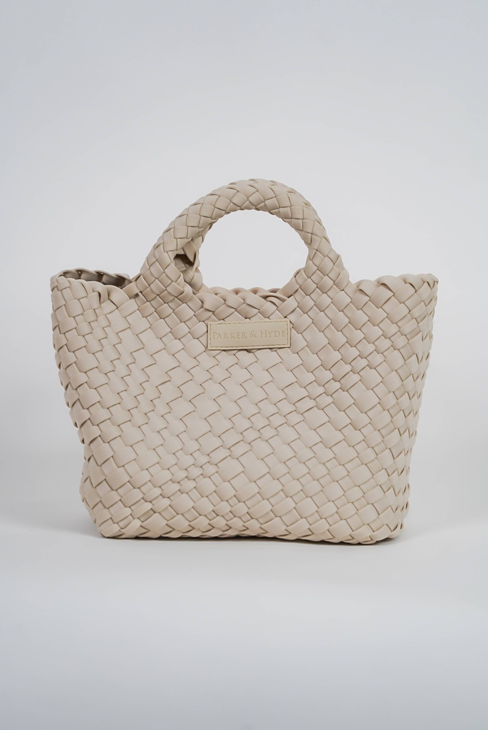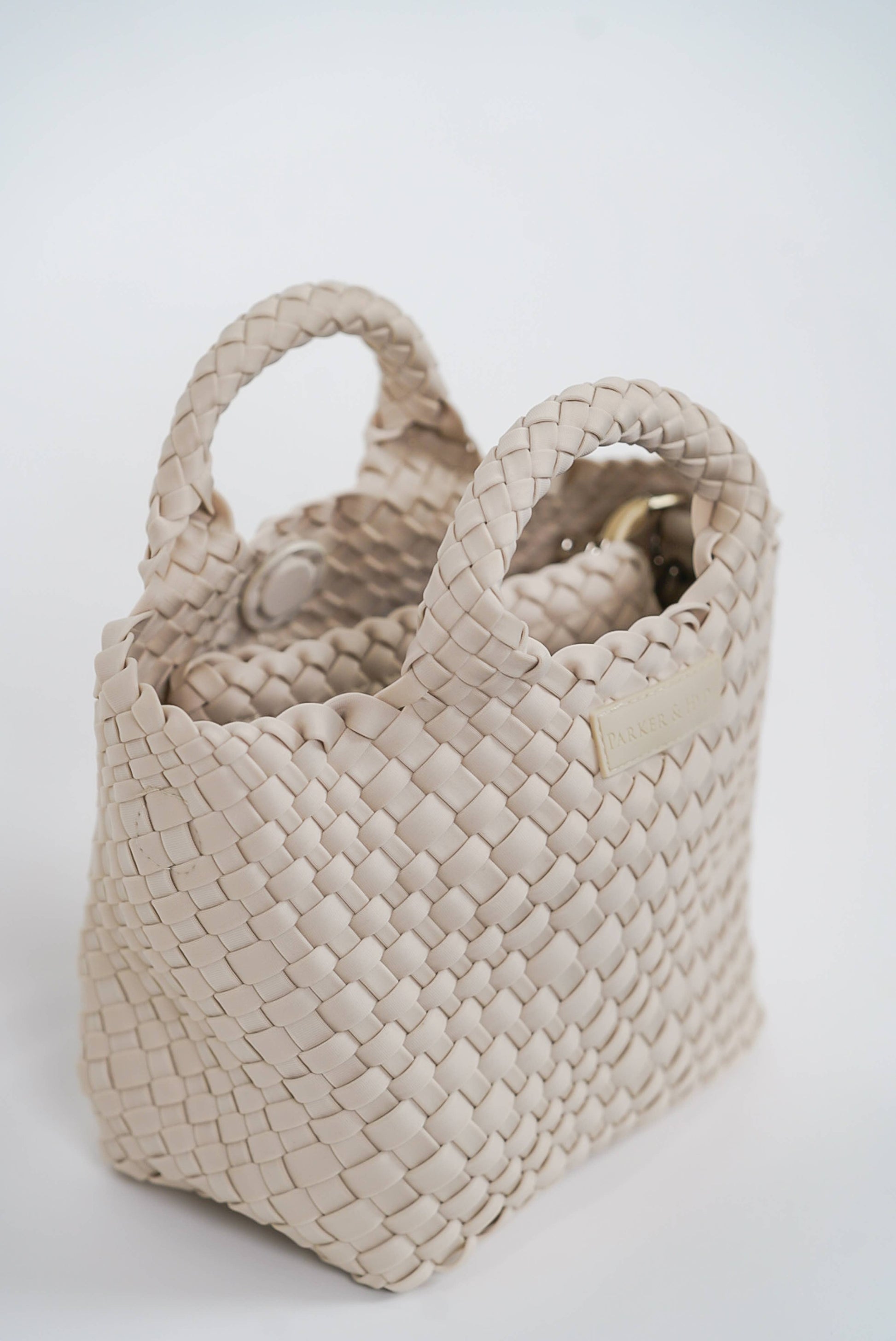 This mini tote features a handwoven design with neoprene material, complemented by a woven pouch and an adjustable crossbody strap. Its dimensions are 12" long, 4.5" wide, and 7.5" high, offering a compact yet functional carry option.
