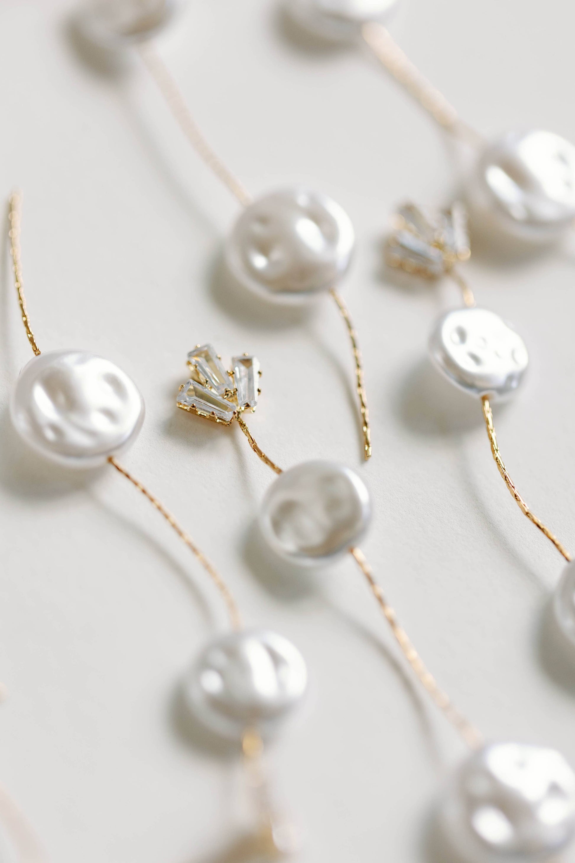 Add an elegant touch to your holiday ensemble with these stunning skinny gold, pearl and diamond swingy drop earrings. These earrings feature pearls suspended from delicate gold chains that gracefully cascade and catch the light, making them a perfect accessory for festive occasions and glamorous celebrations like New Year's Eve.