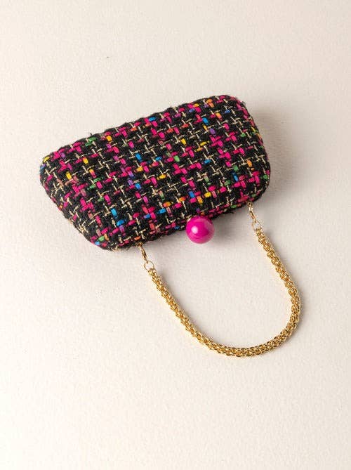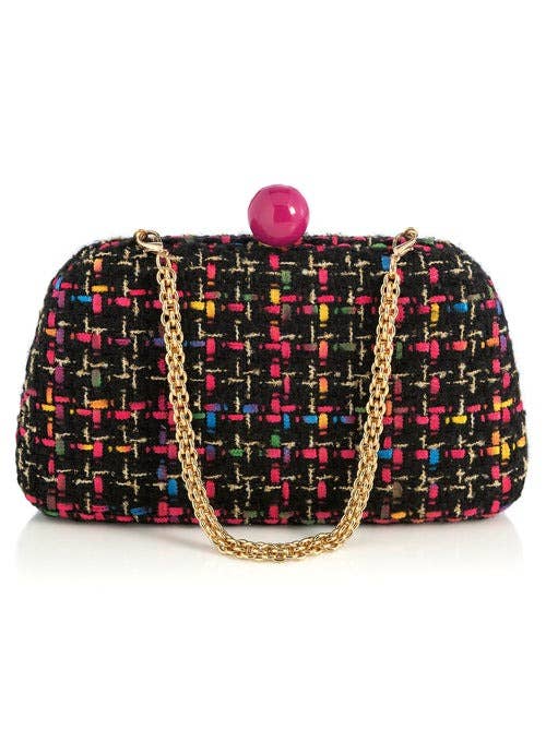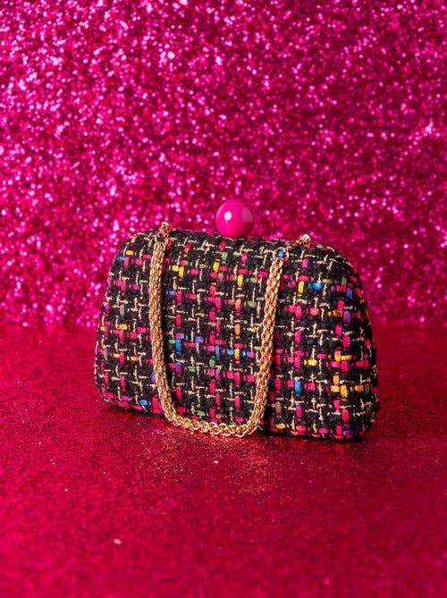 Meet your favorite fall clutch, the Lana Minaudiere from Shiraleah. This versatile bag features a trendy tweed texture in a chic pink and green color pattern with a pink push lock closure. With its interchangeable single handle and cross-body chain, this little purse can be worn as a clutch, a mini bag, or a cross-body! The Lana Minaudière effortlessly exudes style and sophistication. Pair with other items from the Shiraleah collection to complete your look!